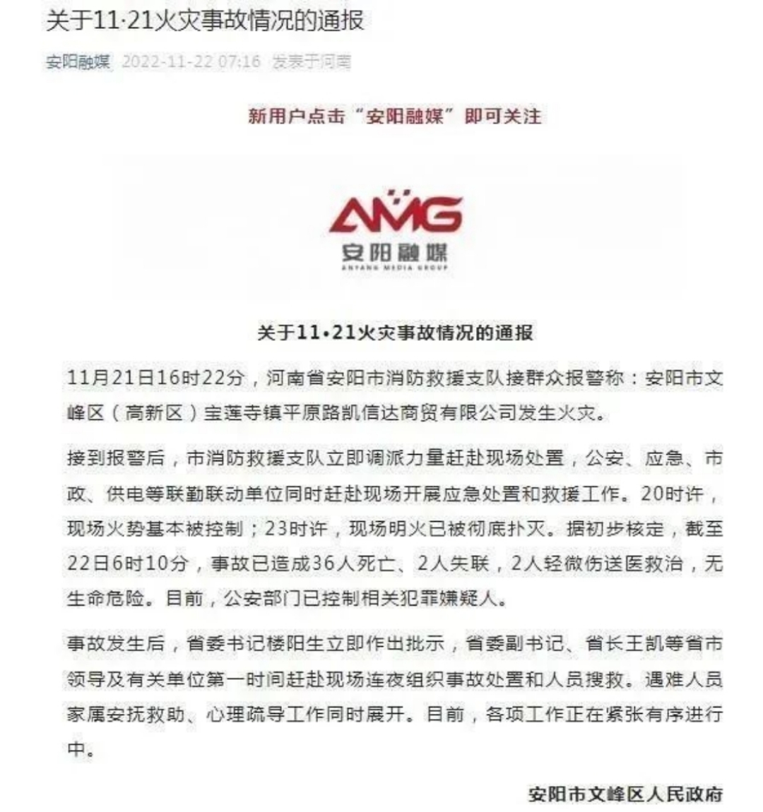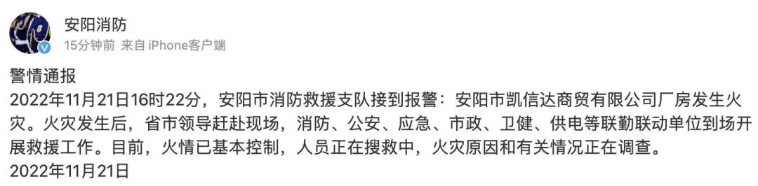 @安陽消防 微博發(fā)布警情通報,2022年11月21日16時22分,安陽市消防救援支隊接到報警:安陽市凱信達商貿有限公司廠房發(fā)生火災。火災發(fā)生后,省市領導趕赴現(xiàn)場,消防、公安、應急、市政、衛(wèi)健、供電等聯(lián)勤聯(lián)動單位到場開展救援工作。目前,火情已基本控制,人員正在搜救中,火災原因和有關情況正在調查。