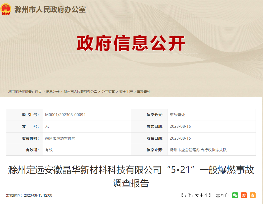 安徽晶華新材料科技有限公司“5?21”一般爆燃事故調查報告公布