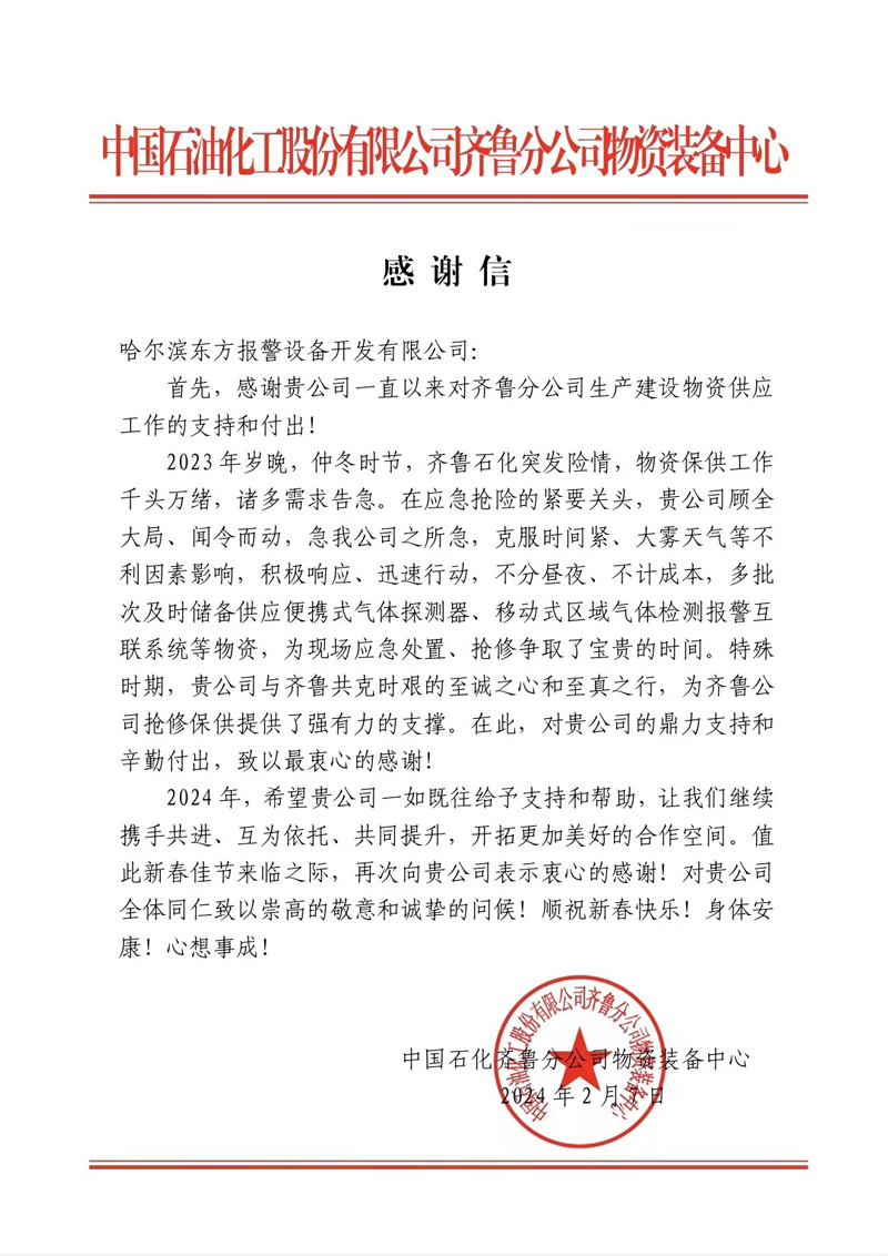 歲末年初,東方報(bào)警收到中國(guó)石油化工股份有限公司齊魯分公司物資裝備中心的感謝信,對(duì)我公司的支援工作給予高度評(píng)價(jià)。