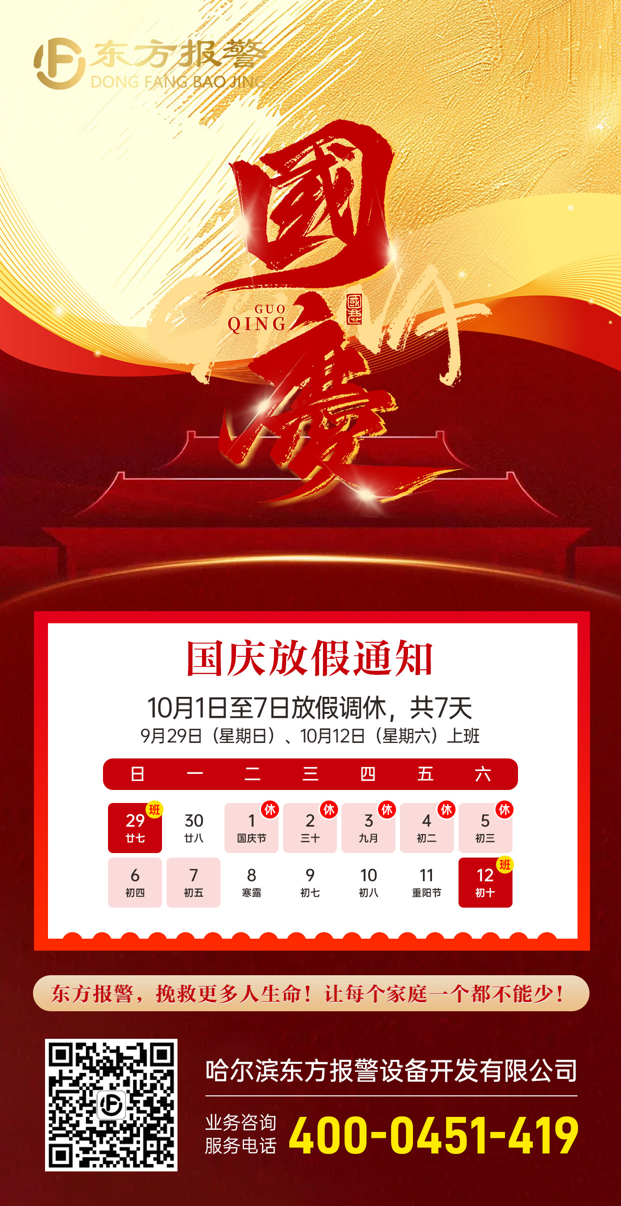 值此金秋送爽、舉國同慶的美好時節(jié),我們迎來了偉大祖國的華誕——國慶節(jié)。首先,哈爾濱東方報警設備開發(fā)有限公司全體同仁向您及您的家人致以最誠摯的節(jié)日問候和美好的祝愿!感謝您一直以來對我司的厚愛與支持,您的信任是我們不斷前進的動力源泉。