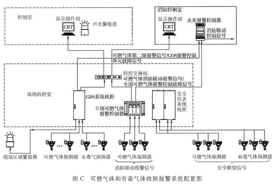 本圖的目的是概念性地說明石化裝置中本可燃氣體和有毒氣體檢測報警系統與火災檢測報警系統及安全儀表系統的界面關系,所以內容簡潔,不具體體現可燃氣體檢測報警系統內部各元件之間具體的信號變換及輸送要求。