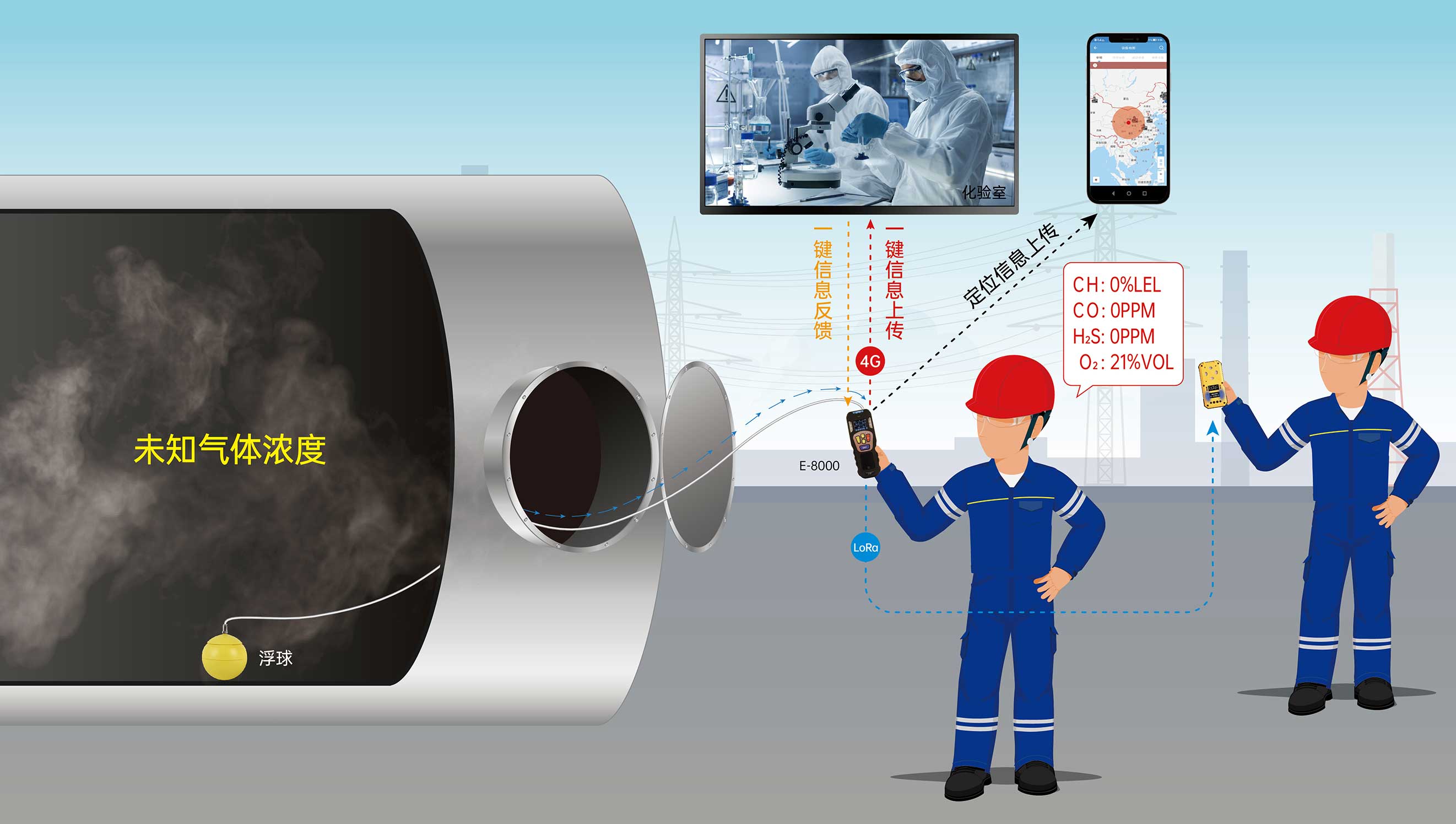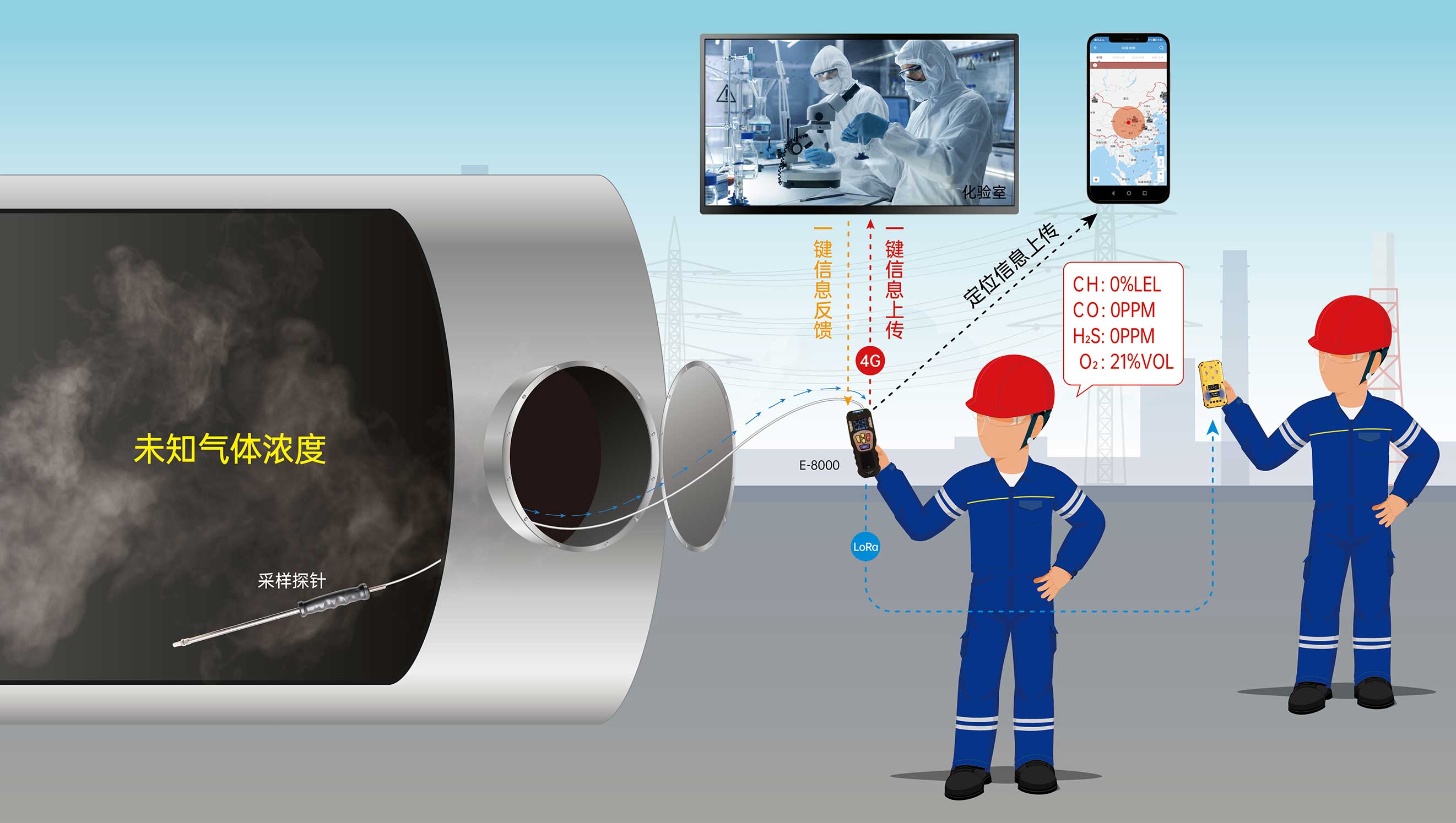 為解決上述受限空間作業票的痛點,東方報警精心設計制造了一款全新便攜式氣體檢測儀——E-8000高時效便攜式氣體分析儀。它采用了泵吸式氣體檢測方式,可同時檢測四種氣體,具有定位功能,可通過一鍵上傳功能上傳檢測數據及環境信息,實現實驗室快速采樣分析、縮短判斷周期,提高采樣分析工作效率;這樣就可以做到作業票實效性與當時作業工況保持一致,符合總公司對于受限空間作業的監管制度。E-8000在實現氣體檢測的同時也能夠實現報警信號的遠距離傳輸,向350米范圍內其他的便攜式氣體檢測預警儀預警,預警信息包括設備位號、報警氣體種類、濃度等信息,并且各類信息能夠通過4G網絡上傳至系統平臺,提高企業工作效率的同時又可以最大限度的保障作業人員的生命安全。
