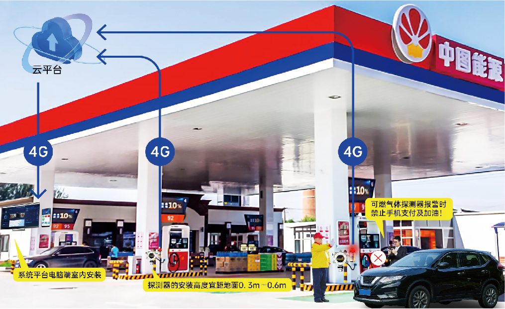 通過對加油站增加可燃氣體探測器及無線聲光報警器等設備,實現了加油站的可燃氣體連續檢測及預警、報警,實現了手機支付的便攜性,提升了工作人員的安全保障,可有效避免發生企業財產損失及人員傷亡事故,提升了可燃氣體泄露報警管控的能力,充分保證加油站日常工作的有序的進行。