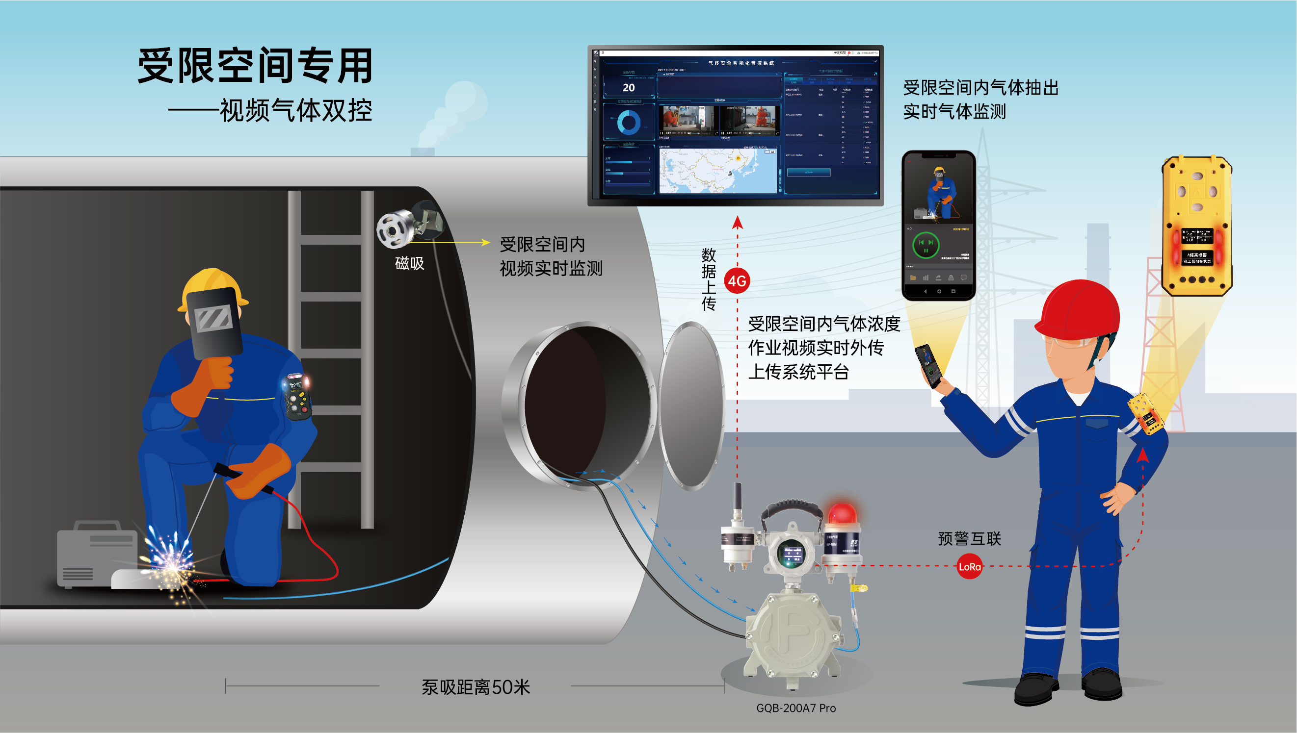 受限空間作業現場環境復雜,危險系數高,極易發生事故,其危險度高的核心問題為危險氣體預報警及作業視頻監控。危險氣體預報警作為受限空間氣體監測的最后一道防線,起到了至關重要的作用,由東方報警公司研制開發的中、小型受限空間解決方案,可有效的對受限空間內的氣體濃度進行實時監測,并將氣體濃度變化進行信息外傳和預警,同時可將氣體檢測數據、報警記錄、以及受限空間內的作業視頻上傳至企業系統平臺進行遠程監管。